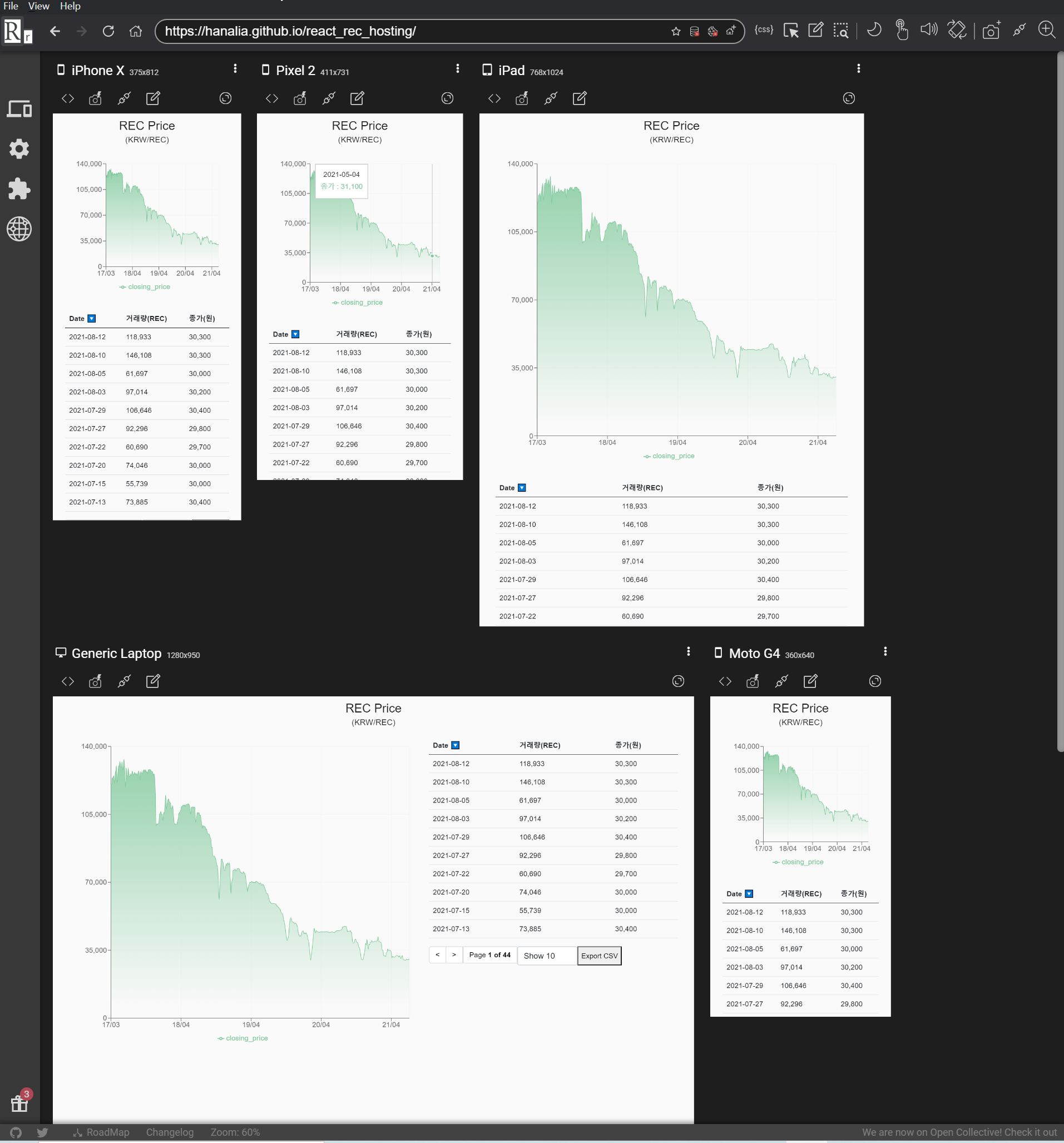또한 Material UI의 Grid Components를 활용하여 화면 크기가 변하면 그래프 및 표의 크기도 동적으로 조정이 되도록 하여 태블릿, 피씨, 휴대폰 등 다양한 화면에서 사용자가 편리하게 볼 수 있도록 하였다. Responsively App을 이용하면 다양한 화면에서 내 앱이 어떻게 보이는지 한눈에 확인할 수 있다.