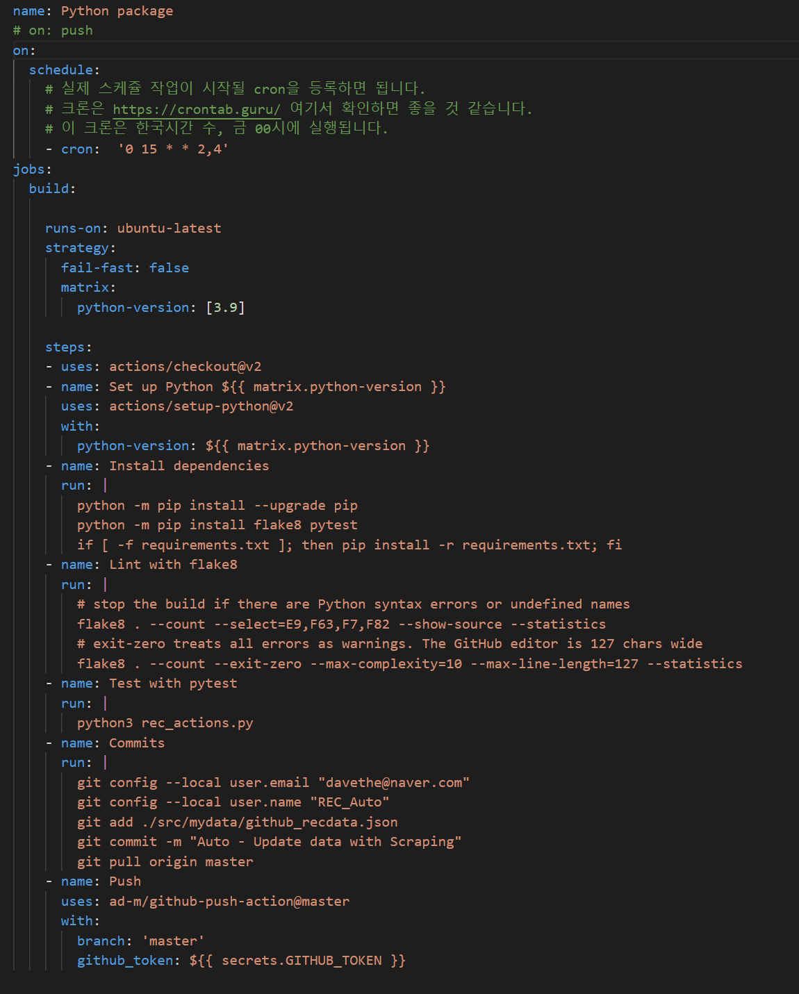 이 프로젝트에서는 코드가 언제 실행되는지 yml 파일에 아래와 같이 명시해 두었는데,