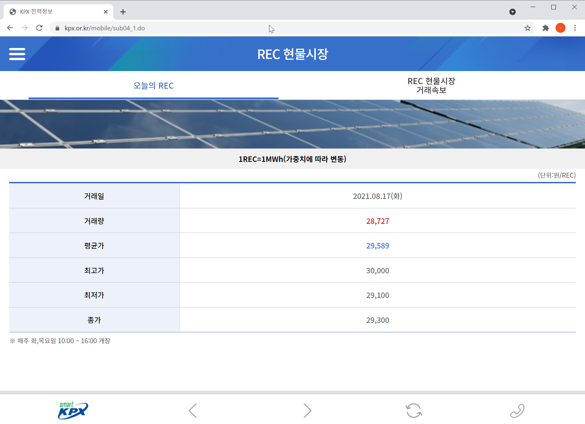 - 이런 양쪽 니즈를 충족시켜주기 위해서 REC 시장이 존재하며, 매주 화, 목요일 10시 ~ 16시마다 열림