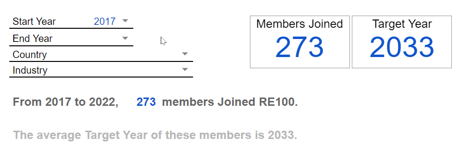 - 필터가 적용됨에 따라 참여 기업 수, 그리고 그 기업들의 평균 목표연도가 자동으로 바뀐다.