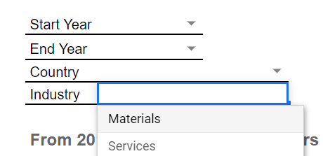 - 그래프 등 시각화 요소 뿐만 아니라 텍스트도 정보 전달의 주요 수단이다. 어떤 사람들은 시각적인 요소보다 텍스트를 통해서 데이터의 시사점에 대해 더 잘 이해하는 경우가 있다. 이런 점을 고려해서 산업, 국가 필터를 추가적으로 선택하는 경우, 해당 산업 + 해당 국가의 기업이 차지하는 비중도 텍스트 형태로 표현하였다.
