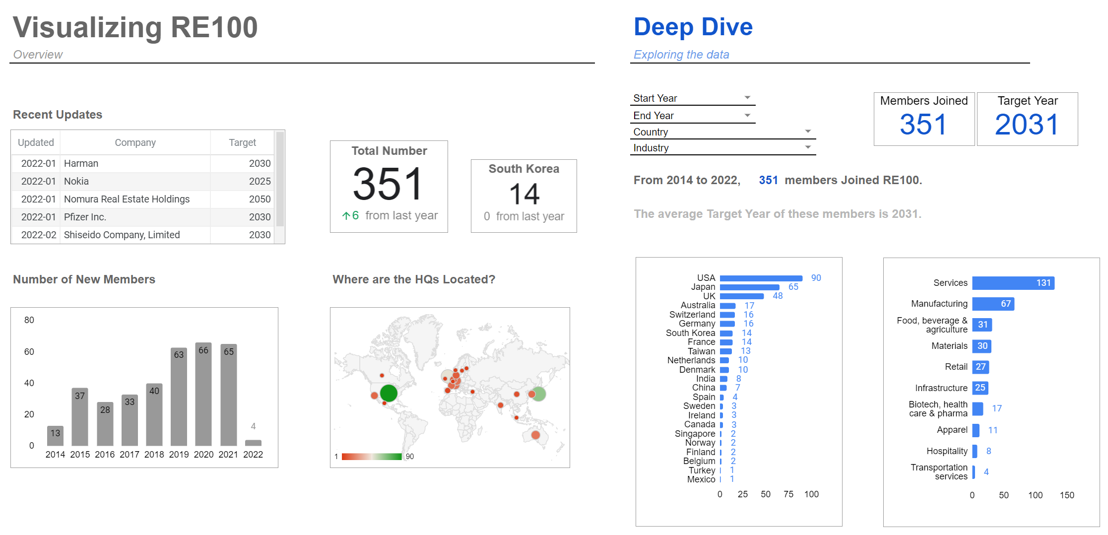 1부 (Overview, 좌측) : RE100 현황을 전체적으로 일목요연하게 볼 수 있음