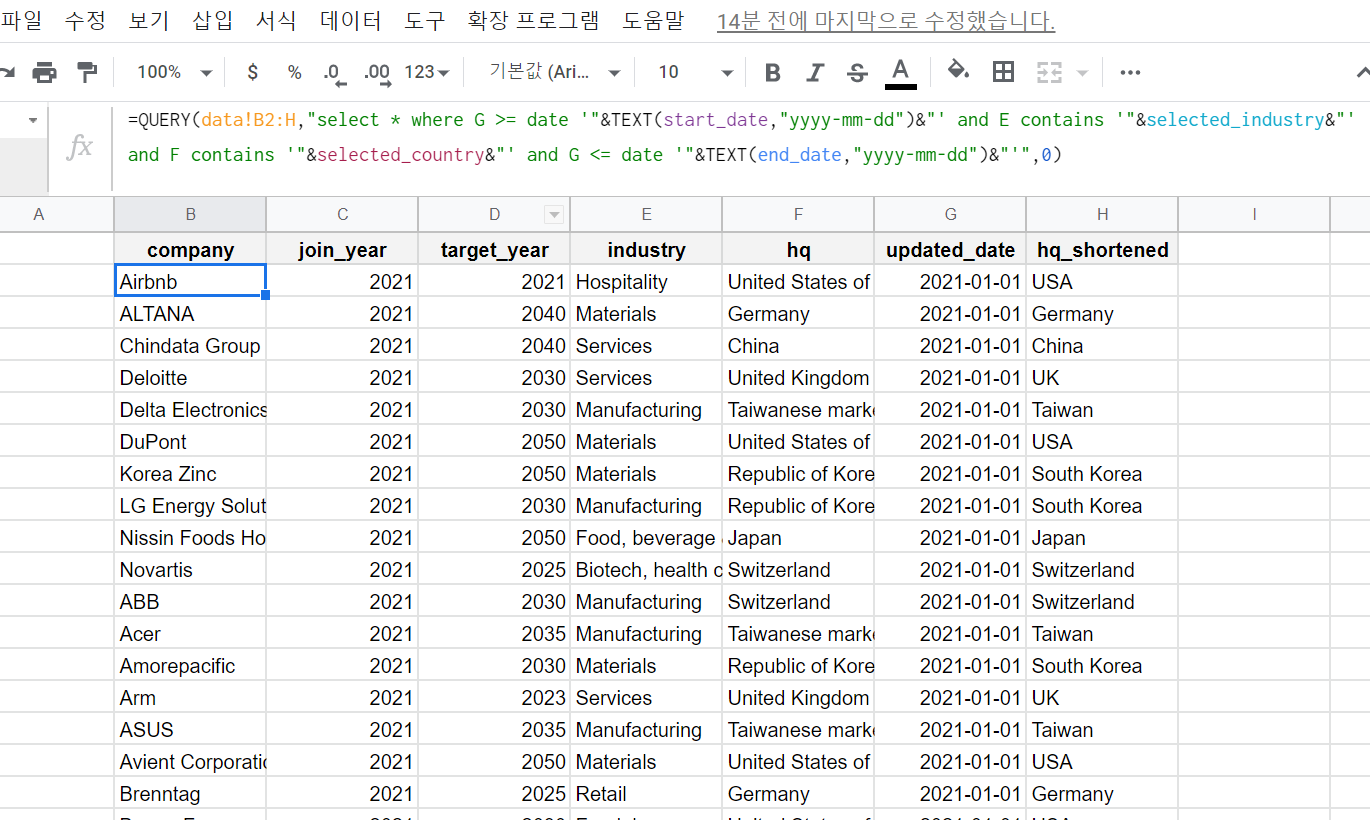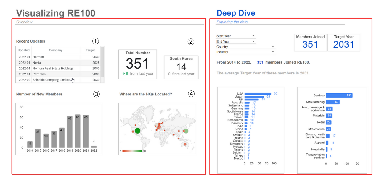 이렇게 1 ~ 5편까지 RE100 기업의 현황을 볼수 있는 인터렉티브 대시보드에 대해서 알아보았다.