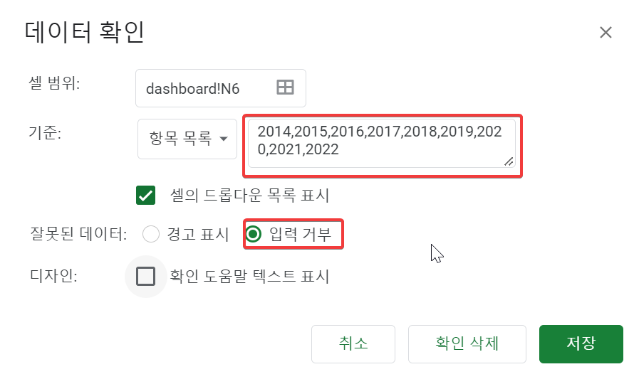 아래와 같이 항목 목록을 클릭하고, 연도를 입력하고 확인을 누르면, 셀에서는 해당 연도에 대한 입력만 가능하다.