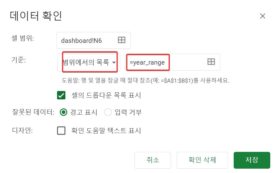 그 다음 연도가 나열된 목록을 year_range라는 이름으로 지정하고, 데이터 확인에서도 year_range라고 범위를 입력해주면 된다.